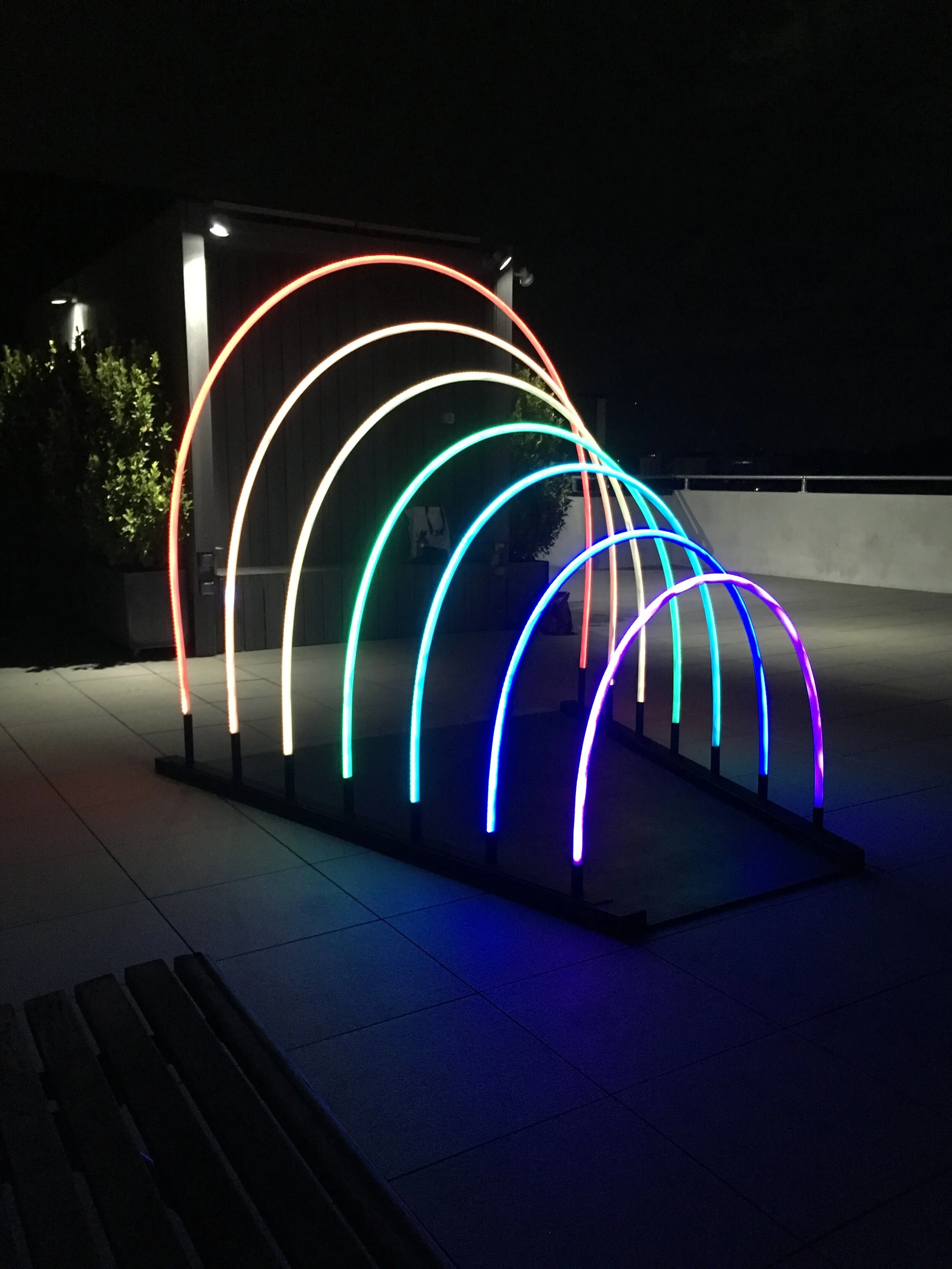 Somewhere Under the Rainbow celebrates the wonder of rainbows and sculpturally expresses statistical data about the global uptake of renewable energy. Reflecting on the cultural symbology of the arch as a threshold for initiation and re-newel, seven consecutive arches form a tunnel that becomes illuminated, via the presence of four solar panels and batteries, becoming a rainbow of the night. This sculpture also demonstrates our increased uptake in renewable energy globally. The length of each arch in the sculpture conveys the measurements of “World renewable energy consumption from 2010-17 in million metric tons of oil equivalent”. Each arch represents a year’s consumption, the smallest being 2010 moving up to the largest, 2017. Each millimetre of length in each arch equates to the MARS Gallery building filled with oil 22 times over. This sculpture illuminates a hopeful message about our action towards a sustainable future.